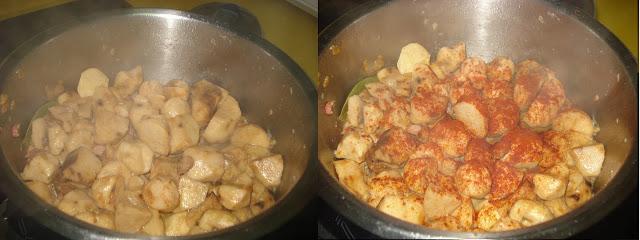 Se rehogan 2 ajos, cuando están dorados se añade la cebolla y el pimiento, una vez que la cebolla esta transparente, se añade el pimentón, la sal el laurel y las trufas.